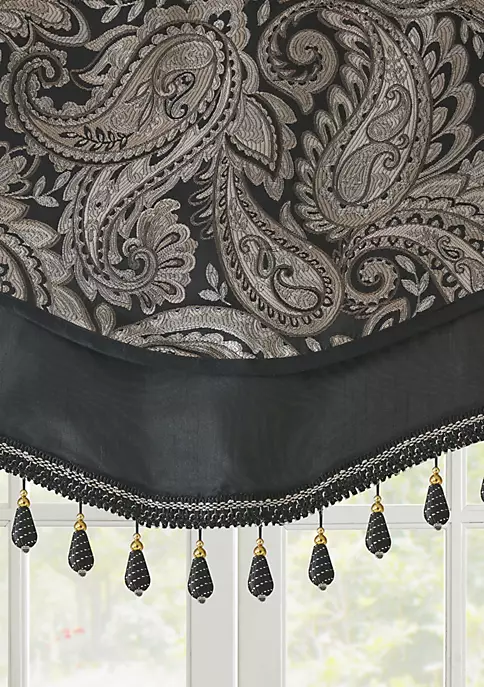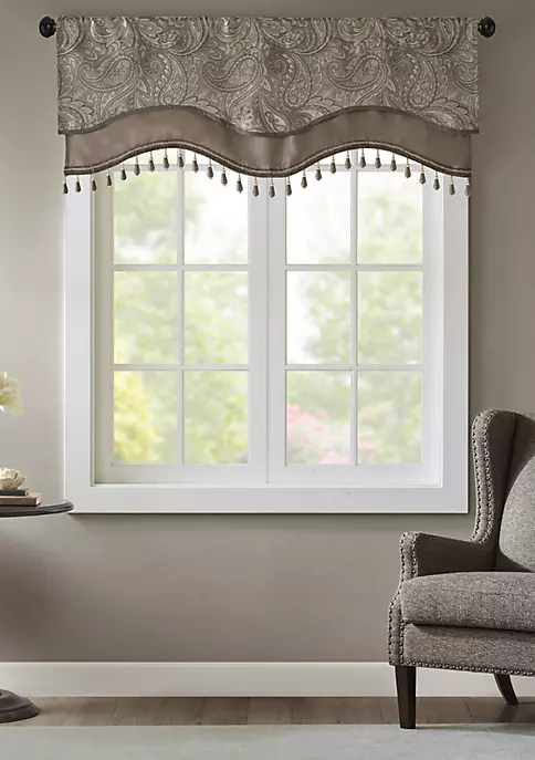 For a unique and luxuriously classic style, the Madison Park Aubrey Beaded Valance is the perfect extra touch to your decor. The alluring jacquard weave is inspired from an updated paisley motif and is woven in beautiful hues and a hint of platinum for a shimmering accent. The window valance features solid faux silk piecing and flat piping details, while delicately finished with a scalloped bottom design and intricate gold bead trim, creating an intriguing elegant look.