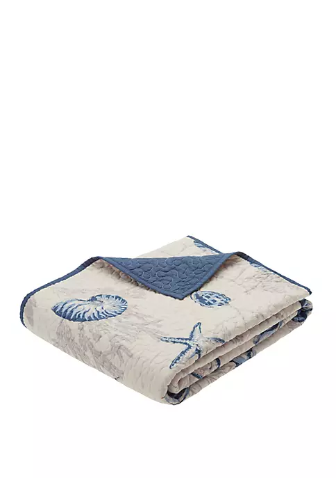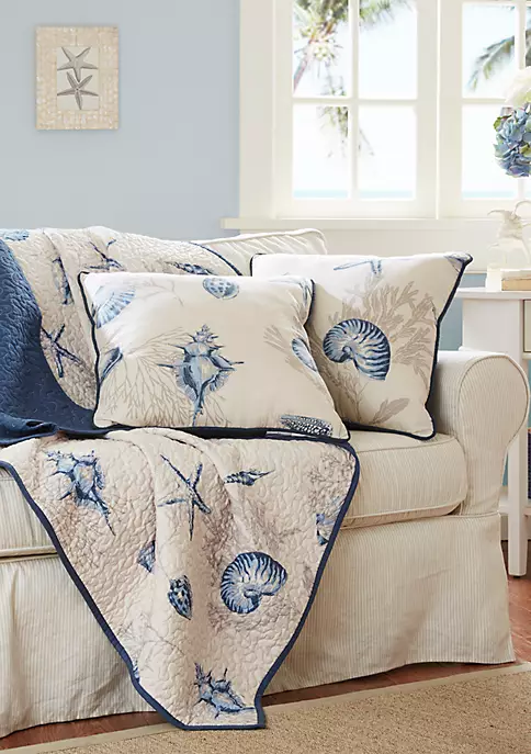 In a deep taupe color, a coral motif is printed on the background to give another dimension to this pattern. The reverse is the same corresponding dark blue from the face. The throw is oversized and overfilled for added comfort and style.