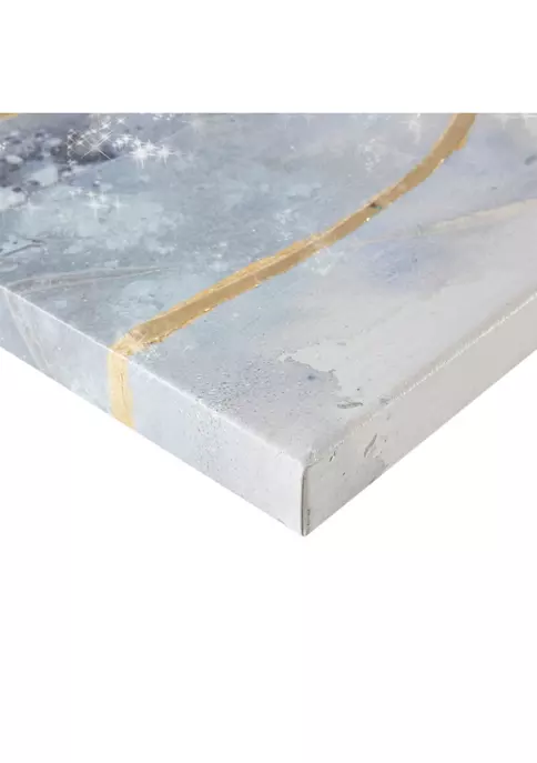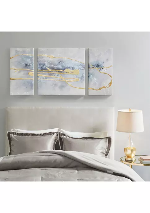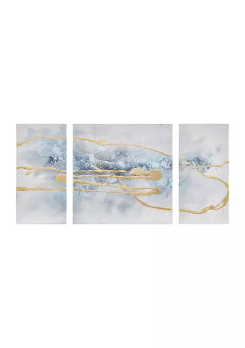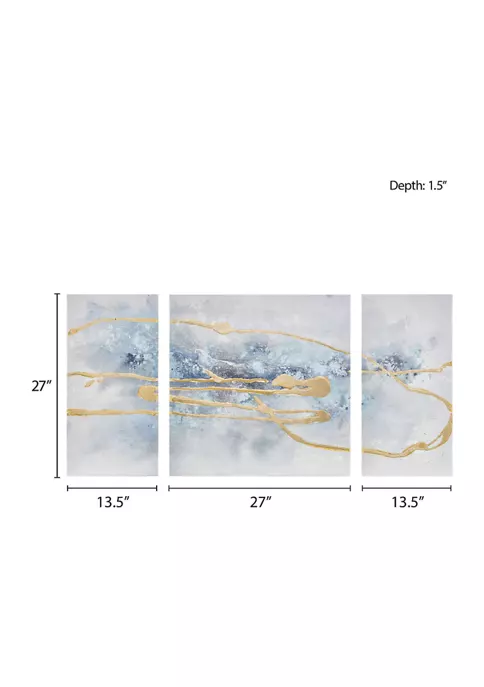 Highlight your space with the Madison Park Blue Cosmo Heavy Textured Canvas with Glitter and Gold Foil Embellishment 3 Piece Set. This three piece canvas wall art set features an abstract desgin in beautiful shades of blue that wash across each canvas. The hand-painted glitter emellishments and gold foil accents help create a striking modern look with a touch of glam. Heavily textured for added dimesnion, this three piece canvas set is easy to hang and adds a luxurious contemporary flair to your home décor.