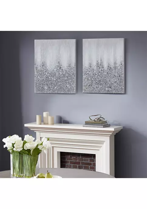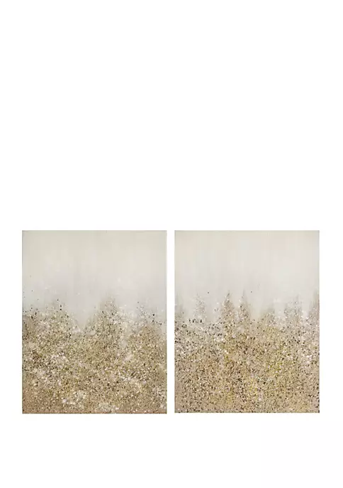 The set of 2 Golden Glimmer Hand Embellished Canvases from Madison Park bring a touch of glam to your home decor. This canvas wall art set features a modern abstract design in gold hues for a striking modern look. 100% hand-brushed and glitter embellishments add texture and dimension, while cardboard backing provides additional structure. Give your home a luxurious update by hanging these pieces in your bedroom or living room.