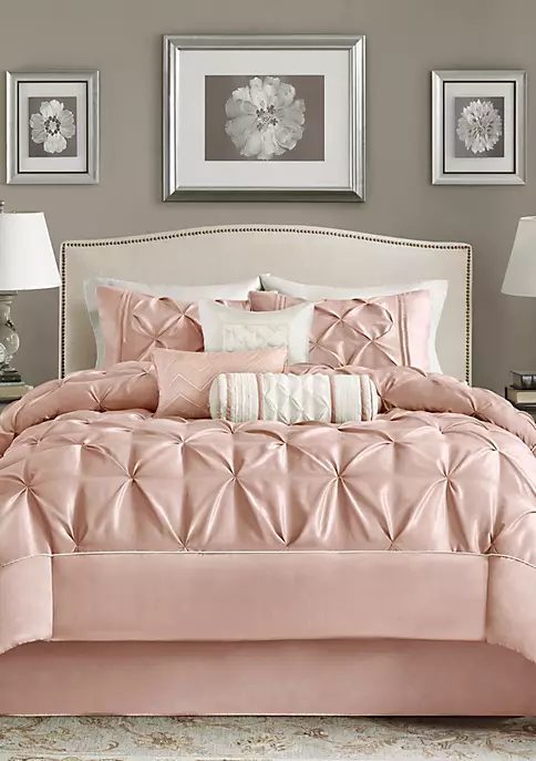 - 1 comforter, 2 standard shams, 1 bed skirt, 3 decorative pillows