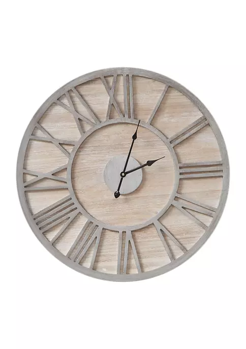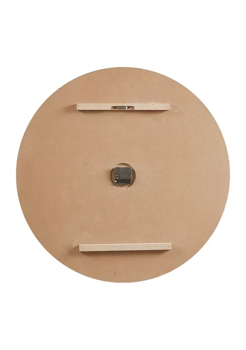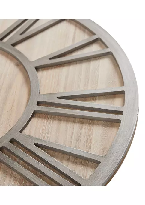 The Madison Park Mason Wall Clock offers a contemporary rustic charm to your home decor. This round clock features a grey metal frame with Roman numeral on a natural wood grain MDF, creating charming farmhouse look. A hanger hook on the reverse makes the clock easy to hang in any room. Measuring 23.6-inches, this large wall clock has quartz movement and brings a modern update to your decor. 1 AA battery (sold separately) is needed. Due to nature of real fir wood surface, product face will vary with some discoloration and wood knots (dot-like markings) unique to each piece.