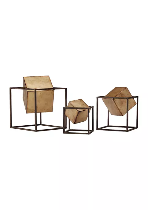 The Madison Park Gold Cube 3 Piece Set shapes up your space with its geometric and modern style. These home decor accents feature black metal frame bases with distressed painted gold cubes on the inside, for a unique and eye-catching look. Comes as a 3 piece set in varying sizes, these metal decorative objects are great for displaying together on table tops and shelves, or separately around your home to add a contemporary touch to any space. Handle with care; wipe gently clean with a damp cloth as needed.