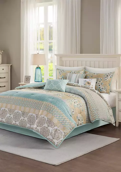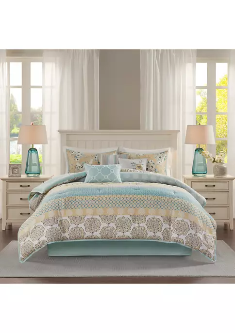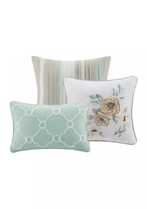 • Set includes 1 comforter, 1 bedskirt, 2 shams, 3 decorative pillows