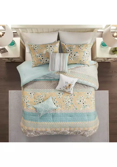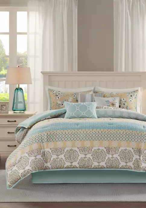 • Set includes 1 comforter, 1 bedskirt, 2 shams, 3 decorative pillows
